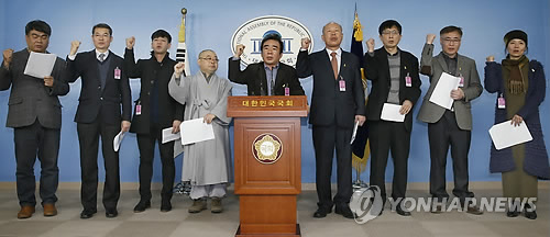 | △ 국민모임 1,050인 선언 기자회견 (서울=연합뉴스) 이상학 기자 = 재야 진보 진영 신당추진체인 국민모임 관계자들이 16일 오전 국회 정론관에서 2차 1,050인 선언 기자회견을 하고 있다. |