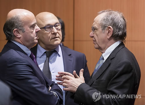 | △ (EPA=연합뉴스) 루이스 데 귄도스 스페인 재무장관(왼쪽부터), 미셸 사팽 프랑스 재무장관, 피에르 카를로 파도안 이탈리아 재무장관이 16일(현지시간) 벨기에 브뤼셀에서 열린 유로그룹(유로존 재무장관 협의체) 회의에 앞서 대화하고 있다. |