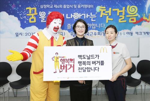 (서울=연합뉴스) 신호경 기자 = 맥도날드(www.mcdonalds.co.kr)는 지난 13일 새터민 어린이들이 다니는 서울시 구로구 '삼정학교' 졸업식에서 학생들과 가족들에게 버거·음료 300인분을 전달했다고 17일 밝혔다.