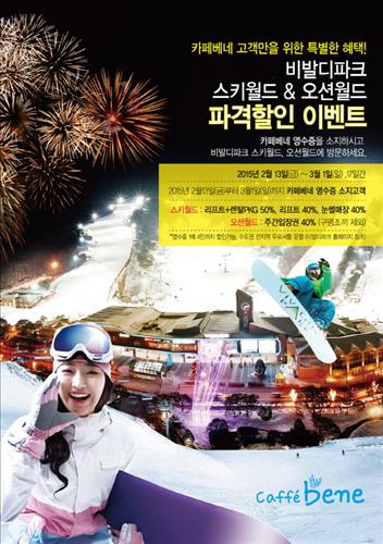 (서울=연합뉴스) 신호경 기자 = 커피전문점 카페베네(www.caffebene.co.kr)가 비발디파크 스키월드·오션월드와 제휴를 통해 최대 50%의 할인 혜택을 제공한다.
