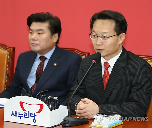 | △ 조해진 원내수석부대표 원내보고 (서울=연합뉴스) 백승렬 기자 = 새누리당 조해진 원내수석부대표가 17일 국회에서 열린 원내대책회의에서 원내보고하고 있다. |