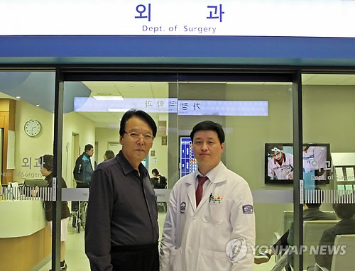| △ "운전중 대동맥파열 버스기사, 승객 안전부터 챙겨" (서울=연합뉴스) 김길원 기자 = 지난달 31일 운행 중 복부 대동맥류가 파열됐지만, 기지와 혼신의 힘으로 승객들을 안전하게 안내하고 응급실로 실려간 관광버스 기사 이희남 씨(왼쪽)가 자신을 하이브리드 수술로 건강을 회복시켜준 서울성모병원 혈관이식외과 김장용 교수와 기념촬영을 하고 있다. (서울성모병원 제공) |