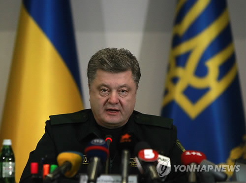 | △ 우크라 휴전협정이 발효 사흘째를 맞았으나 합의사항이 안 지켜져 무산 우려가 커지고 있다. 사진은 지난 15일(현지시간) 우크라이나의 수도 키예프에서 페트로 포로셴코 대통령이 국방부 관리들과의 회동 중 동부 지역 분리주의 반군과의 교전중단 명령을 내리고 있다.(AP=연합뉴스) |
