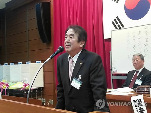 | △ 재일민단 단장 재선된 오공태 씨 (도쿄=연합뉴스) 조준형 특파원 = 18일 도쿄 미나토(港)구에서 열린재일본대한민국민단(민단) 중앙본부 단장(임기 3년) 선거에서 재선한 오공태(68) 단장이 인사말을 하고 있다. 오 단장은 18일 제53회 정기 중앙대회 겸 단장 경선에서 454표를 얻어 58표에 그친 이부철(64) 전(前) 가나가와(神奈川)현 본부 단장을 누르고 재선에 성공했다. 2015.2.18 jhcho@yna.co.kr |