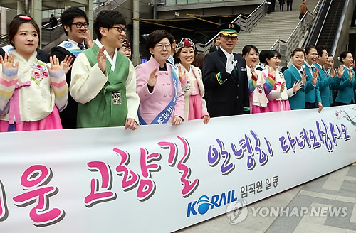 | △ 설 연휴를 하루 앞둔 17일 서울역에서 코레일 임직원이 귀성객들에게 인사를 하고 있다. <<연합뉴스DB>> |