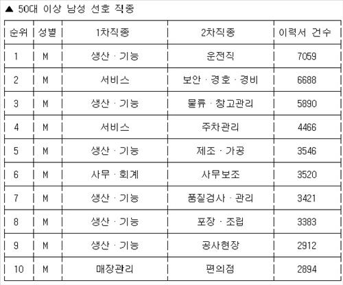 성별로 구분해보면 50대 남성이 가장 선호하는 일자리는 운전직과 보안·경호·경비이고, 50대 여성은 대형마트 매장관리와 고객상담이다.