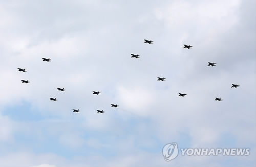 | △ 지난해 10월 창설 60주년 기념행사에서 '60'을 상징하는 대형으로 비행하는 일본 항공자위대 전투기 편대 (AP=연합뉴스 자료사진) |