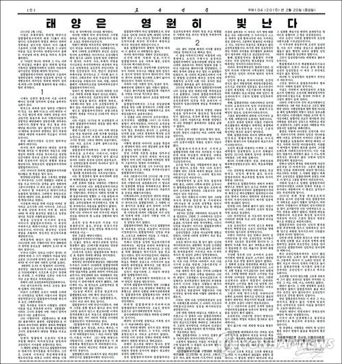 | △ 이탈리아 친북 기업가, 김정은 찬양글 기고 (서울=연합뉴스) 이탈리아 한 친북 기업가가 김정일 국방위원장 생일(2월16일)을 맞아 북한 매체에 김정은 국방위원회 제1위원장을 찬양하는 글을 기고했다. 노동당 기관지 노동신문은 20일 5면 상단에 장카를로 엘리아 발로리 이탈리아종합투자그룹 이사장 명의의 '태양은 영원히 빛난다'라는 글을 게재했다. 사진은 노동신문에 게재된 발로리 이사장의 글. 2015.2.20 nkphoto@yna.co.kr |