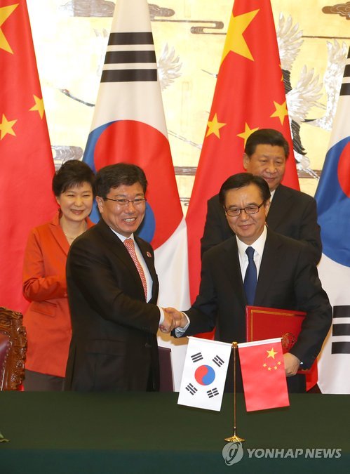 | △ 지난해 11월 10일 오전 중국 베이징 인민대회당에서 박근혜 대통령과 시진핑 중국 국가주석이 지켜보는 가운데 윤상직 산업통상자원부 장관과 가오후청 중국 상무부장이 한중 자유무역협정(FTA)에 서명한 뒤 서명서를 교환하며 악수하고 있다. 연합뉴스 자료사진. dohh@yna.co.kr |