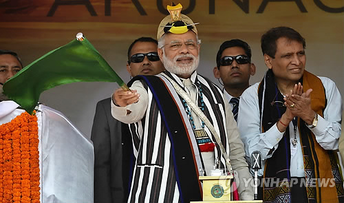 | △ 20일(현지시간) 인도 아루나찰 프라데시 주 주도 이타나가르에서 나렌드라 모디 총리가 수도 델리에서 아루나찰 프라데시까지 2천100㎞를 잇는 철도 완공을 축하하고 있다.(EPA=연합뉴스) |