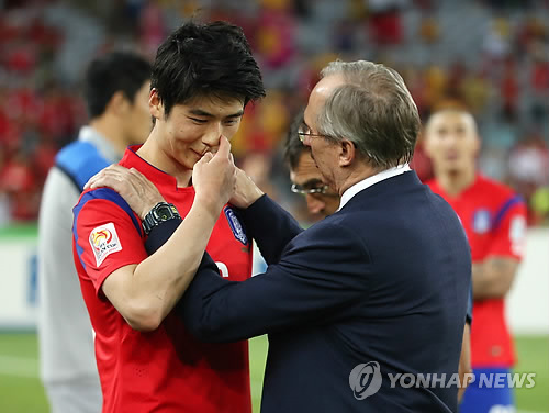 | △ '캡틴' 고생많았어! (시드니=연합뉴스) 임헌정 기자 = 31일 호주 시드니의 스타디움 오스트레일리아에서 열린 2015 AFC 아시안컵 결승전 대한민국 대 호주 경기. 슈틸리케 감독이 경기가 끝난 뒤 기성용을 격려하고 있다. 2015.1.31 kane@yna.co.kr |