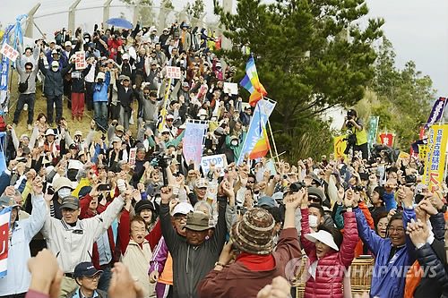 | △ 일본 오키나와서 미군기지 반대 대규모 시위 (오키나와 교도=연합뉴스) 일본 오키나와(沖繩)현 후텐마(普天間) 미군기지(기노완시)의 현내 이전 대상지인 헤노코(邊野古·나고시)에서 22일 주민 3천명 이상(주최측 발표)이 참가한 가운데, 대규모 항의 집회가 열렸다. 2015.2.22 jhcho@yna.co.kr |