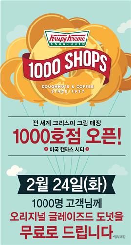 (서울=연합뉴스) 신호경 기자 = 세계적 도넛 브랜드 '크리스피 크림 도넛'(www.krispykreme.co.kr)이 세계 1천호점(미국 켄자스 시티 소재) 개장 기념으로 24일 국내 10개 매장에서 도넛 무료 증정 행사를 진행한다.