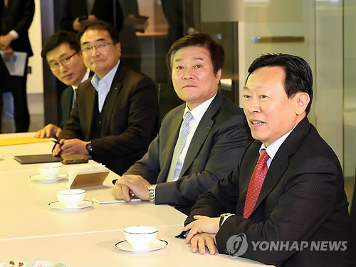 | △ (부산=연합뉴스) 11일 부산을 찾은 신동빈 롯데그룹 회장(맨 오른쪽)이 부산창조경제혁신센터에서 부산지역 상공인들과 간담회를 갖고 있다. 2015.2.11 joseph@yna.co.kr |