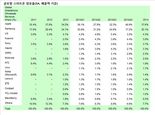삼성은 스마트폰 시장에 본격적으로 뛰어든 2010년 이후 줄곧 애플과의 격차를 좁히며 2013년에는 34.1%를 기록, 애플(34.2%)을 턱밑까지 추격했으나 다시 10%포인트 넘게 밀리게 됐다.