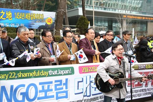 | △ 독도가수 서희 씨가 23일 오후 서울시 종로구 수송동 일본대사관 앞에서 독도NGO포럼 주최로 열린 일본의 '다케시마의 날' 행사 항의 집회서 '신 독도는 우리땅'을 노래하고 있다. |