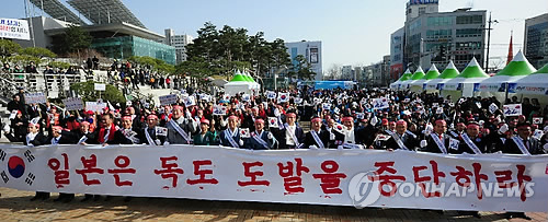 | △ 독도는 명백한 우리 땅 (포항=연합뉴스) 우리 땅 독도에 대한 일본의 침탈 야욕을 규탄하는 대규모 궐기대회가 23일 경북 포항시청 앞 광장에서 경북도, 포항시, 울릉군 관계자와 시민 등 1천500여명이 모인 가운데 열렸다. 2015.2.23 shlim@yna.co.kr |