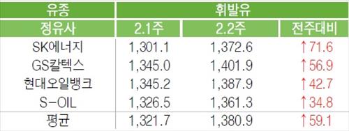 정유사의 2월 둘째주 휘발유 공급가격은 전주보다 ℓ당 평균 59.1원 상승한 1천380.9원으로 확인됐다.