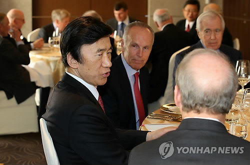 | △ 윤 외교장관, 美 외교협회 대표단 초청 오찬 (서울=연합뉴스) 전수영 기자 = 윤병세 외교부장관이 23일 서울 소공동 롯데호텔에서 열린 미국 외교협회(CFR) 대표단 초청 오찬에서 리차드 하스(오른쪽 뒷모습) 회장 등 참석자들과 환담하고 있다. |