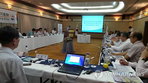 | △ 아프리카·중동 한인회 총연합회 정기총회 (빅토리아폭포<짐바브웨>=연합뉴스) 류일형 특파원 = 아프리카·중동 한인회 총연합회(회장 임도재)가 지난 23일(현지시간) 남부아프리카 짐바브웨 빅토리아 폭포 엘리펀트 힐 호텔에서 정기총회를 열어 아중동 한상연합회를 출범시켰다. 초대 아중동 한상연합회장에는 신동철(58) 아랍에미리트(UAE) 한인회장이 선출됐다. 2015.2.25 photo@yna.co.kr |