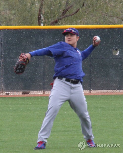 | △ 3년 만에 우익수 추신수 수비훈련 (서프라이즈<미국 애리조나주>=연합뉴스) 장현구 특파원 = 미국프로야구(MLB) 텍사스 레인저스의 추신수가 23일(현지시간) 미국 애리조나주 서프라이즈 스타디움에서 열린 단체 훈련에서 수비훈련을 하고 있다. 2015.2.24 cany9900@yna.co.kr |