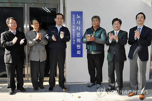 | △ 현대차 노사 통상임금 해법 모색…자문위 출범 (울산=연합뉴스) 장영은 기자 = 현대자동차 노사는 20일 울산공장 아반떼룸에서 윤갑한 현대차 사장, 이경훈 노조위원장, 김동원 고려대 교수 등 노사 관계자 40여 명이 참석한 가운데 임금체계 및 통상임금 개선위원회 노사 자문위원 위촉식을 열었다.2014.11.20 << 현대자동차 제공 >> young@yna.co.kr |