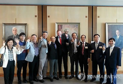 | △ 호주 연방의회, 북한 인권개선 결의안 첫 채택 (서울=연합뉴스) 23일 호주 연방의회에서 북한인권결의안이 통과된 뒤 크레이그 론디 의원(왼쪽에서 여섯번째)과 북한인권개선 호주운동본부 관계자들이 환하게 웃고 있다. (북한인권개선 호주운동본부 제공) |