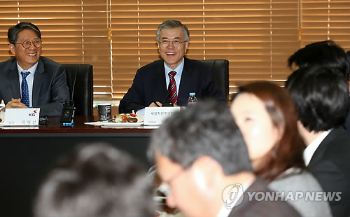 | △ 전자결재 회사 방문한 문재인 대표 (성남=연합뉴스) 신영근 기자 = 24일 오후 정보통신기술(ICT) 선도기업 방문에 나선 새정치민주연합 문재인 대표(가운데)가 경기도 성남의 한 전자결재 회사에서 직원들과 간담회 시간을 갖고 있다. |