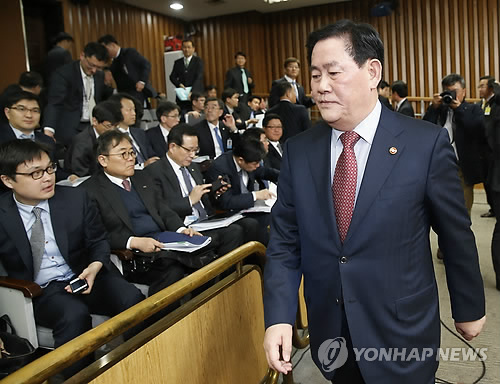 | △ 굳은 표정의 최경환 부총리 (서울=연합뉴스) 이상학 기자 = 최경환 경제부총리 겸 기획재정부 장관이 24일 국회 정부 및 공공기관 등의 해외자원개발 진상규명을 위한 국정조사특별위원회 전체회의에서 여야 의원들의 공방으로 회의가 정회되자 굳은 표정으로 밖으로 나가고 있다. |