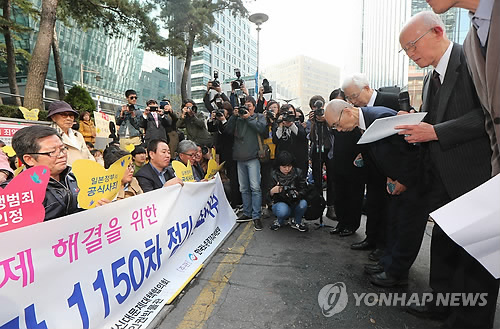 | △ 일본인 10명 가운데 8명은 '전후 70년 ' 여론조사에서 자국 정부가 충분히 사과했다고 생각하는 것으로 조사됐다. 지난해 10월 29일 서울 일본대사관 앞에서 한일친선선교협력회 소속 일본인들이 '위안부' 피해자들에게 사죄하고 있다.(연합뉴스 자료사진) |