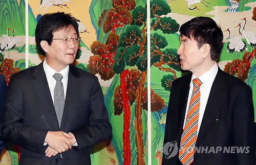 | △ 유승민 현정택 대화 (서울=연합뉴스) 진성철 기자 = 새누리당 유승민 원내대표(왼쪽)와 현정택 청와대 정책조정 수석이 25일 국회 사랑재에서 열린 당정청 정책조정협의회에서 대화하고 있다. |
