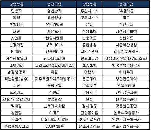 서비스부문에서는 삼천리[004690](도시가스), GS25(편의점), 신한은행(은행) 등 9개 기업이 12년 연속 1위를 지켜냈다.