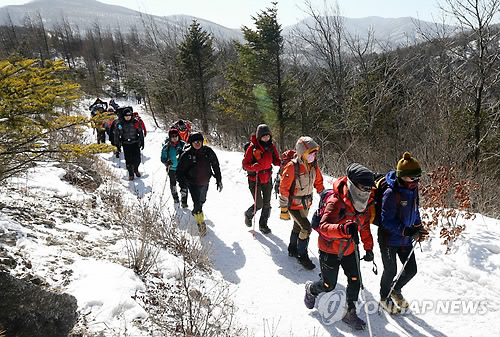 | △ 한국인이 가장 좋아하는 취미는 등산인 것으로 조사됐다. 칼바람이 몰아친 8일 등산객들이 눈 쌓인 백두대간 선자령을 오르고 있다. |
