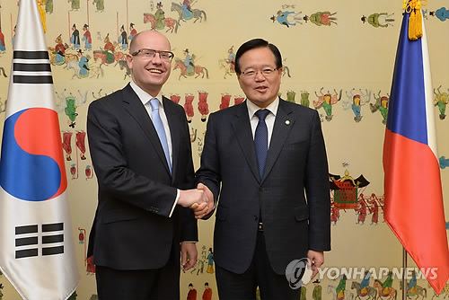 | △ 체코 총리 국회 예방 (서울 국회사진기자단=연합뉴스) 정의화 국회의장이 25일 국회를 예방한 보후슬라프 소보트카 체코 총리와 인사하고 있다. |