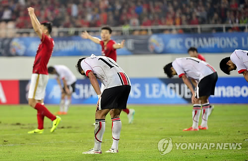 | △ 아쉬운 패배 (광저우 사진공동취재단=연합뉴스) 25일 오후(현지시간) 중국 광저우 텐허 스타디움에서 열린 2015 아시아축구연맹(AFC) 챔피언스리그 조별예선 H조 1차전 FC 서울과 광저우 에버그란데 타오바오의 경기에서 1:0으로 패한 서울 선수들이 아쉬워 하고 있다. 2015.2.25 photo@yna.co.kr |