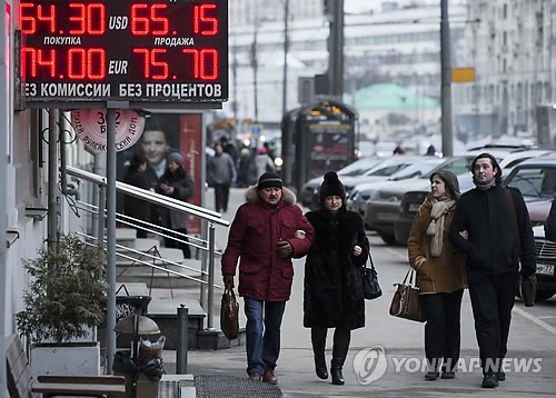 | △ 지난달 20일(현지시간) 러시아 모스크바에서 시민들이 1년사이 반토막난 루불화 시세판 옆을 지나고 있다. 우크라이나 사태와 이로 인한 서방의 제재, 국제 유가 폭락 등으로 러시아 경제가 악화되는 가운데 국제신용평가기관 무디스는 최근 올해 러시아의 국내총생산(GDP) 성장률을 마이너스 5.5%로 전망했다. 이는 최근 발표된 러시아 성장률 전망 중 가장 낮은 수치다. <<연합뉴스DB>> |