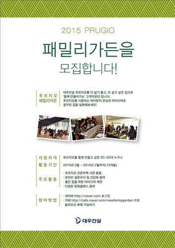 (서울=연합뉴스) 서미숙 기자 = 대우건설[047040]은 아파트 고객자문단 '푸르지오 패밀리 가든'의 신규 회원을 모집한다고 26일 밝혔다.