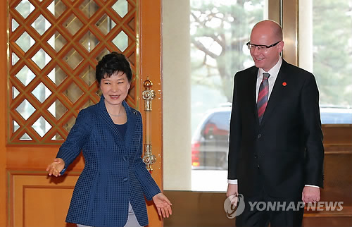 (서울=연합뉴스) 박성민 기자 = 박근혜 대통령과 방한중인 보후슬라프 소보트카 체코 총리는 26일 청와대에서 정상회담을 하고 양국 관계를 일반 수교 관계에서 전략적동반자 관계로 격상하는데 합의했다.