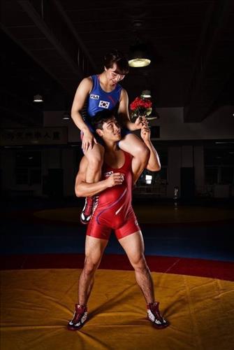 땀과 꿈이 섞인 태릉선수촌 레슬링 연습장에서 경기복을 입고 애정을 과시하는 사진이다.