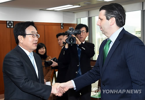 | △ 악수하는 리퍼트 미 대사와 서병수 부산시장 (부산=연합뉴스) 마크 리퍼트 주한 미 대사와 서병수 부산시장이 27일 오전 부산시청에서 남북문제 등에 관해 환담하기 전 악수하고 있다. (부산시 제공) |