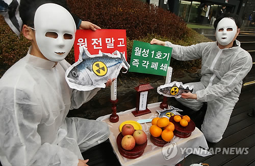 | △ 월성1호기 폐쇄 기원 (서울=연합뉴스) 김주성 기자 = 환경운동연합 회원들이 16일 오후 서울 광화문 원자력안전위원회 앞에서 설계수명이 끝나 3년째 가동이 중단된 월성 원전 1호기의 폐쇄를 촉구하는 차례 퍼포먼스를 하고 있다. 2015.2.16 utzza@yna.co.kr |