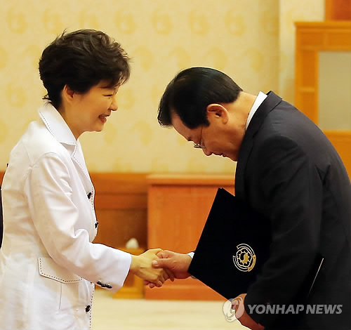 | △ 이병기 신임 비서실장과 박 대통령 (서울=연합뉴스) 박근혜 대통령이 27일 오후 신임 청와대 비서실장에 이병기 국정원장을 내정했다. 사진은 지난해 7월 국정원장 임명장 수여식에서의 모습. |