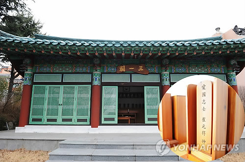 | △ 울산중구 삼일사당 (울산=연합뉴스) 울산 병영3.1만세운동으로 순국하거나 옥고를 치른 26명의 애국지사 위패가 모셔진 울산 중구 동동의 삼일사당. 사진 원 안은 아직 후손이 나타나지 않은 최원득 애국지사의 위패. 2015.2.27 << 울산중구 제공 >> canto@yna.co.kr |
