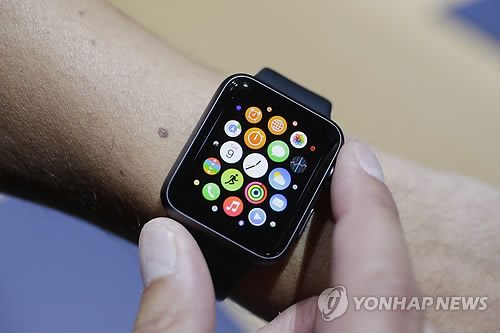 | △ 애플의 시계 모양의 웨어러블 단말기 '애플 와치' (AP=연합뉴스) |