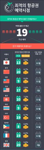 한국에서 출발할 항공권을 구매할 때에는 출국 19주전에 예약해야 동일한 조건의 티켓이라도 가장 쌌다. 항공권 구입비용을 연간 평균치에 비해 5.4% 절감할 수 있었다.