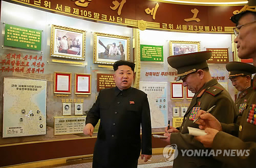 | △ 김정은 전승기념관 시찰…"전체 부대를 근위부대화" (서울=연합뉴스) 북한 김정은 국방위원회 제1위원장이 평양 조국해방전쟁승리기념관(전승기념관)에 새로 조성한 근위부대관을 방문했다고 노동신문이 28일 보도했다. 노동신문은 이날 보도에서 황병서 총정치국장의 이름을 최룡해 당비서에 앞서 언급해 시선을 모았다. 김 제1위원장이 근위부대관을 시찰하는 모습. |