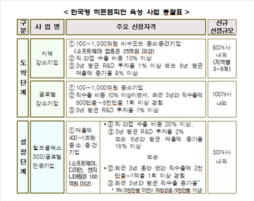 (서울=연합뉴스) 임은진 기자 = 중소기업청은 글로벌 경쟁력을 갖춘 중소·중견기업(히든챔피언) 양성을 위해 기업역량에 따라 도약기와 성장기로 나눠 지원한다고 1일 밝혔다.