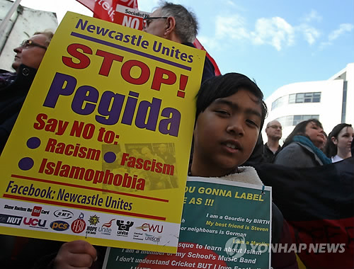 (뉴캐슬 AFP·dpa=연합뉴스) 독일에서 시작된 반이슬람 운동단체 '페기다'(PEGIDA.유럽의 이슬람화를 반대하는 애국적 유럽인들)가 지난달 28일(현지시간) 영국에서 처음 집회를 열었다.