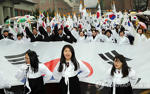 | △ '선배들 만세운동 함께해요' (광주=연합뉴스) 박철홍 기자 = 제 95주년 3·1절인 1일 오전 광주 남구 양림동 수피아여고에서 '광주 3.1 만세운동 재현행사'가 열려 비가오는 와중에도 학생들과 시민들이 대형 태극기를 들고 만세삼창을 하며 행진하고 있다. |