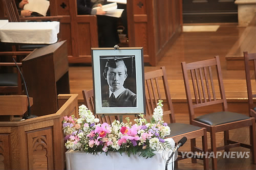 | △ 도쿄 릿쿄대에서 윤동주 70주기 추도 예배 (도쿄=연합뉴스) 조준형 특파원 = 22일 오후 시인 윤동주(1917∼1945)가 생전 8개월 가량 다녔던 도쿄 릿쿄(立敎)대의 예배당에서 윤 시인 70주기 추도 예배가 열렸다. 시인의 생전 사진이 예배당에 놓여있다. jhcho@yna.co.kr 2015.2.22 |